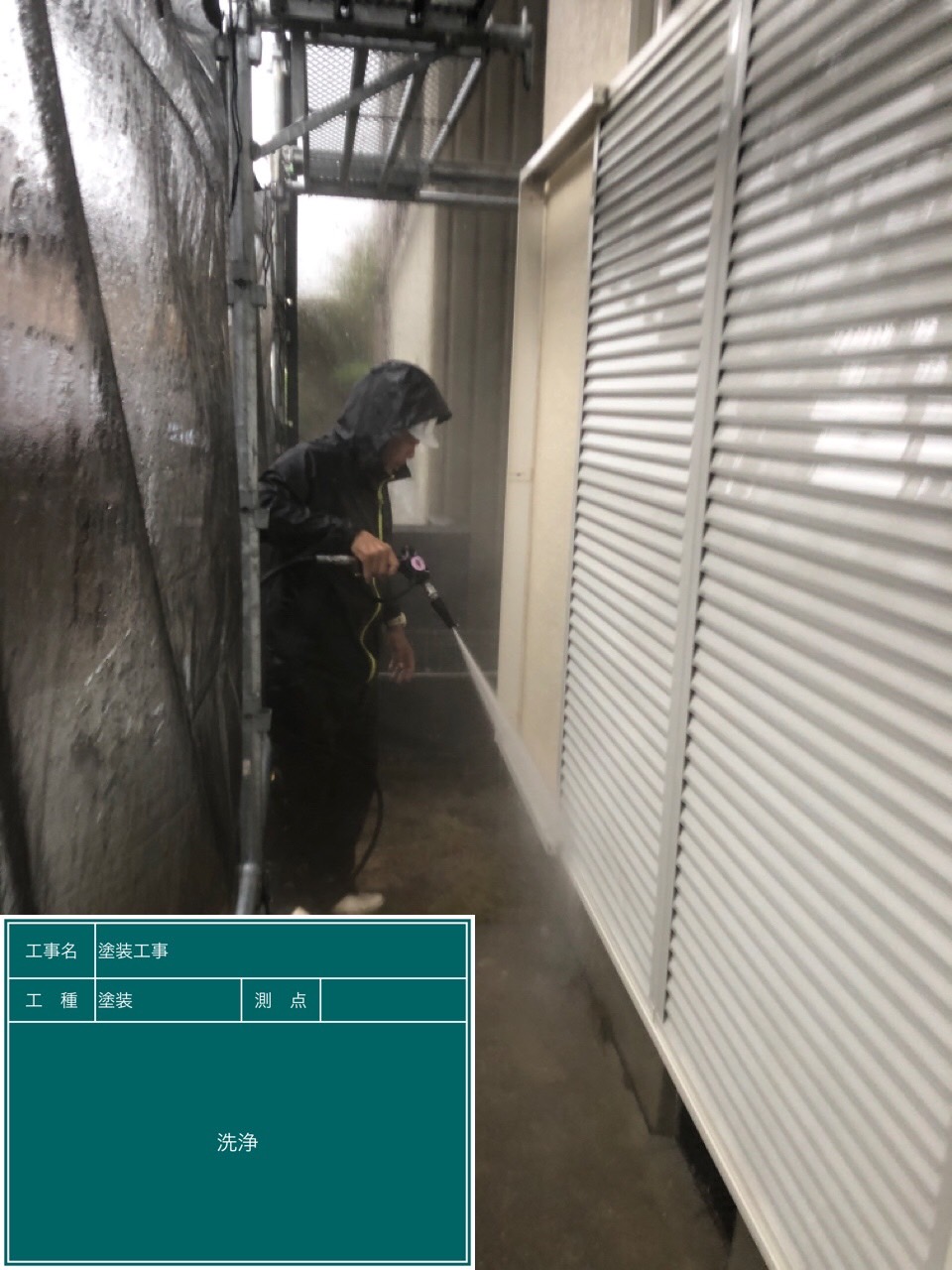 足場の組み立て後、水洗浄の水飛沫や塗料の飛散を