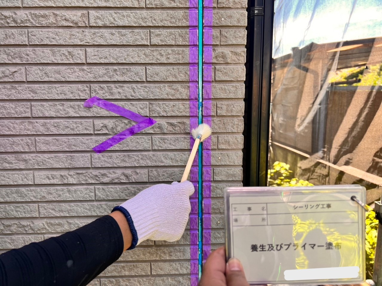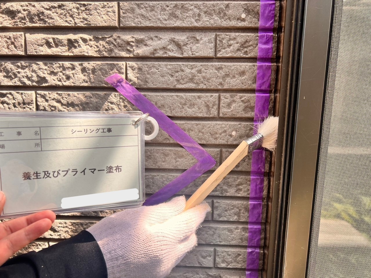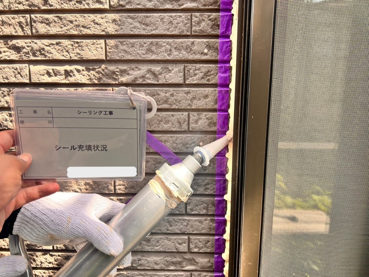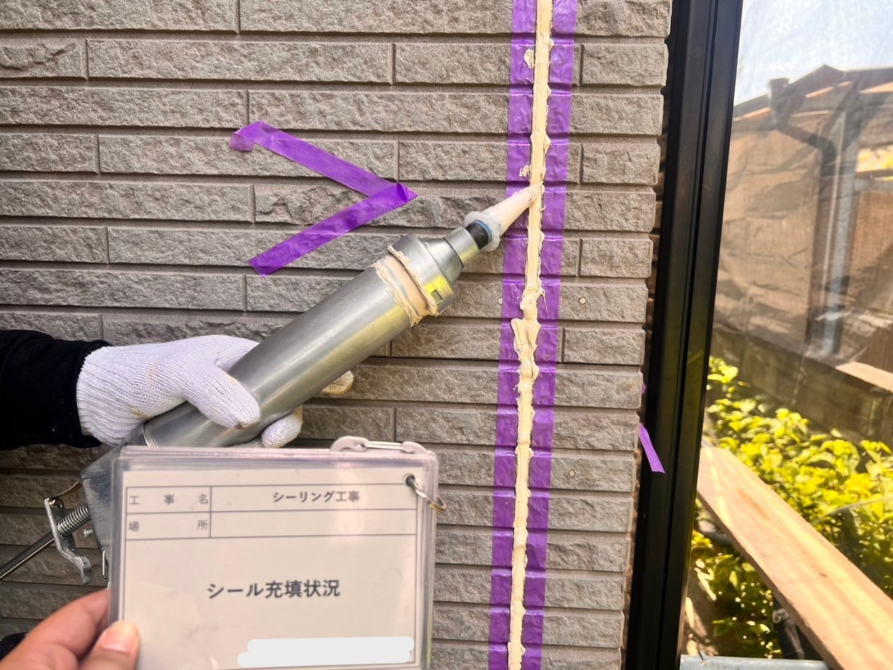 プライマー塗布後、コーキングガンという専用の機械で