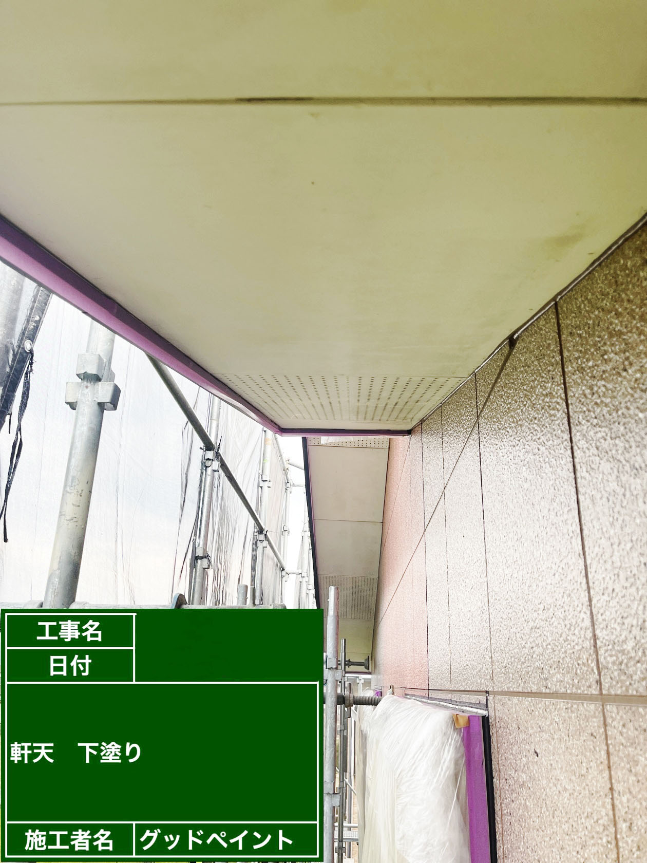 K様邸進捗状況 2022/02/27 K様邸工事の進捗状況です。 非塗装面養生、軒天塗装、外壁下塗り完了しました。 非塗装面養生 非塗装面養生 軒天塗装 外壁下塗り 和歌山県での外壁塗装、屋根塗装はグッドペイントにお任せ下さい! 外壁診断士による外壁診断、ドローンでの屋根診断、お見積り、全て無料でやらせていただきます。