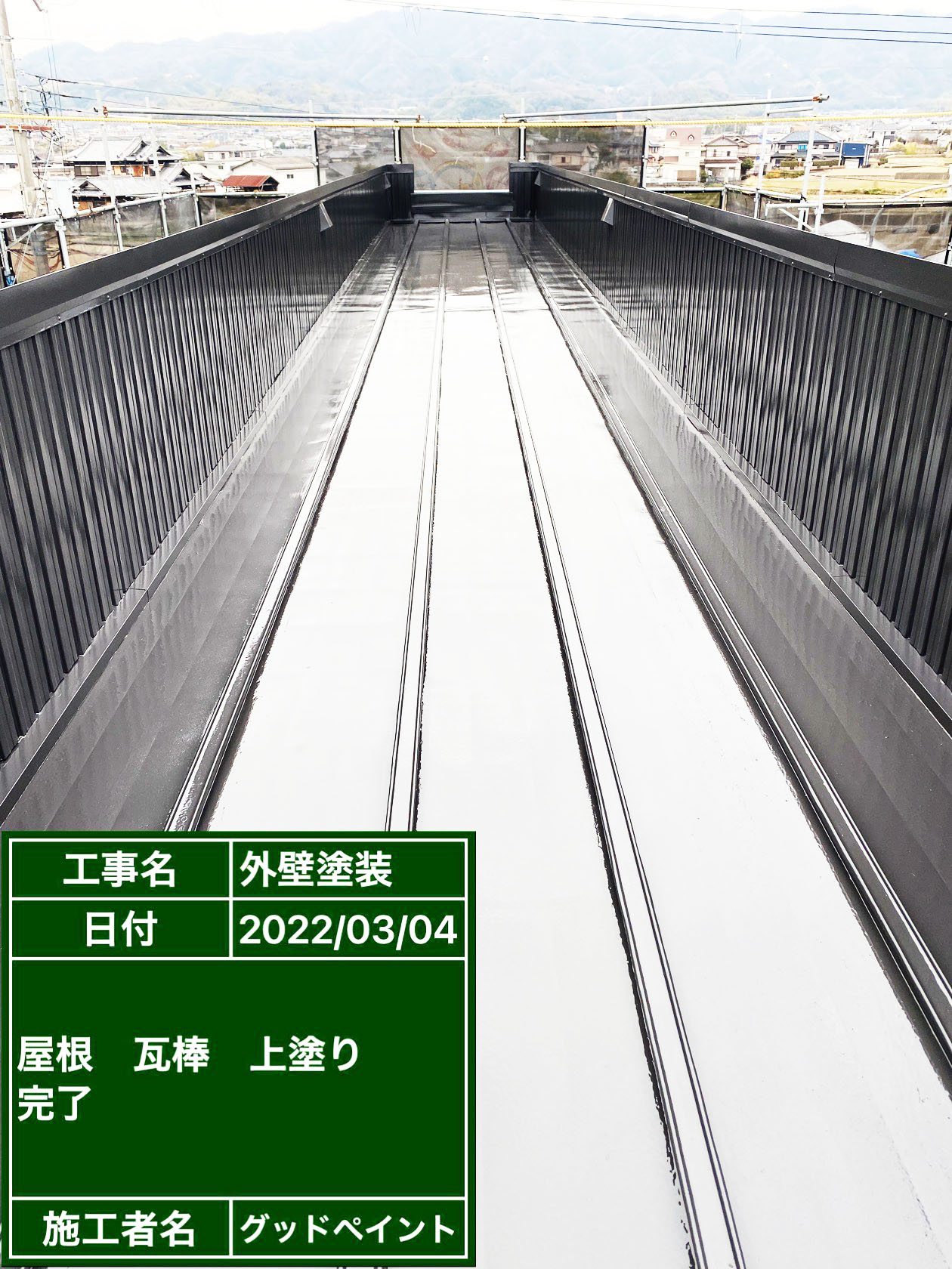 W様邸進捗状況 2022/03/20 W様邸の進捗状況です。 屋根瓦棒上塗り完了しました! 屋根瓦棒上塗り施行中 屋根瓦棒上塗り完了 和歌山県での外壁塗装、屋根塗装はグッドペイントにお任せ下さい! 外壁診断士による外壁診断、ドローンでの屋根診断、お見積り、全て無料でやらせていただきます。